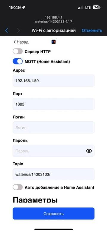 Подключение к HA осуществляется по протоколу MQTT. Ватериус с версии 0.11.8 поддерживает discovery сообщение, поэтому HA должен сразу увидеть устройство с параметрами.